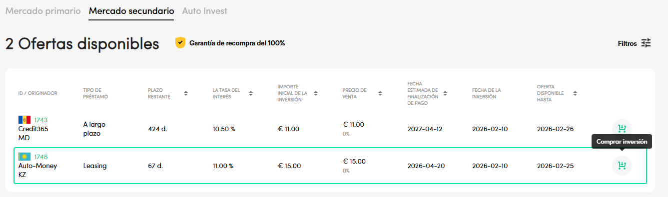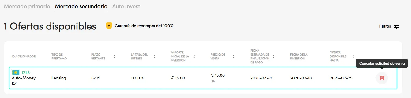 El Mercado Secundario es una función de la plataforma que permite a los inversores vender sus inversiones activas antes de que se realice el reembolso final. Está diseñado para proporcionar liquidez a los inversores cuando necesiten disponer de su capital.