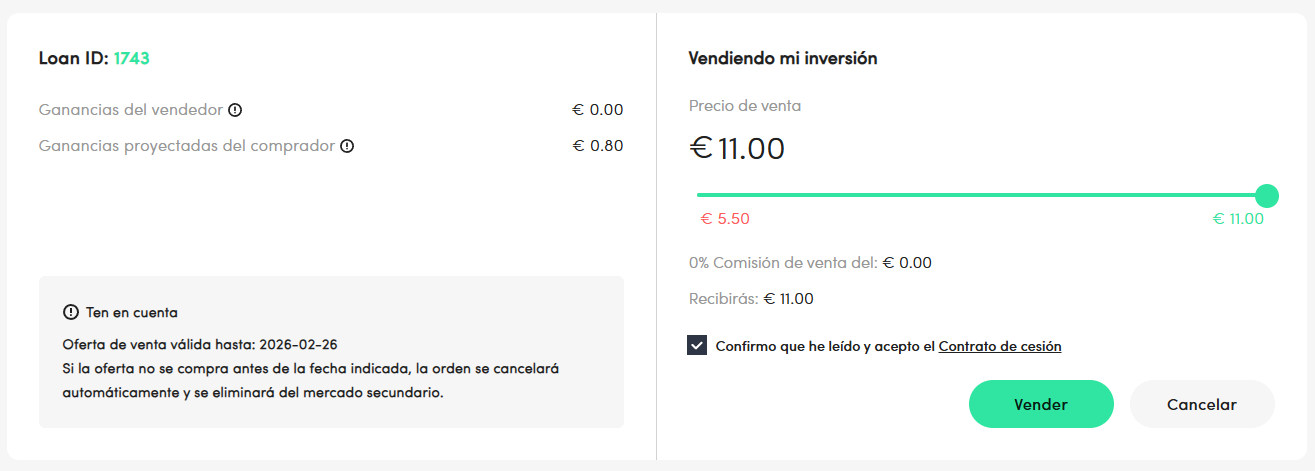 Al pinchar en ‘Vender’, confirmarás y compartirás tu oferta de venta en el mercado secundario de la plataforma (la oferta estará activa durante 14 días naturales; si la inversión no se compra en este periodo, la oferta se cancelará automáticamente).